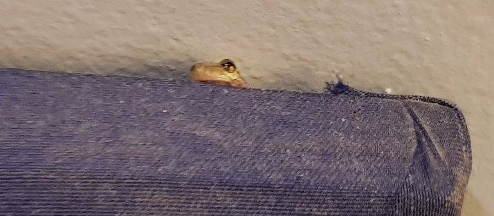 So this little animal – which we think is a little frog – is making an official Bad Decision and starting to eeeease its way across our ceiling.