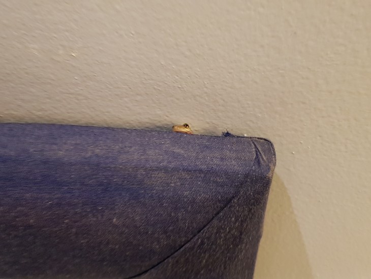 So this little animal – which we think is a little frog – is making an official Bad Decision and starting to eeeease its way across our ceiling.