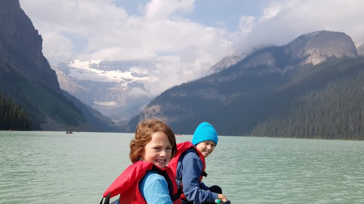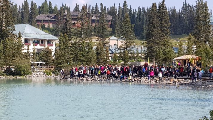 This is what they are looking at. Well, not the girls but the lake and mountains behind. Lake Louise is probably the single most visited attraction in the Rockies after Banff. It is easy to get to and on the motorway. The green colour comes from the rock flour and it goes back to blue in the winter when there is less water coming off the glacier and rock walls.
